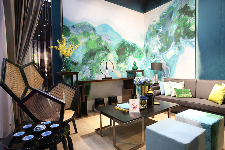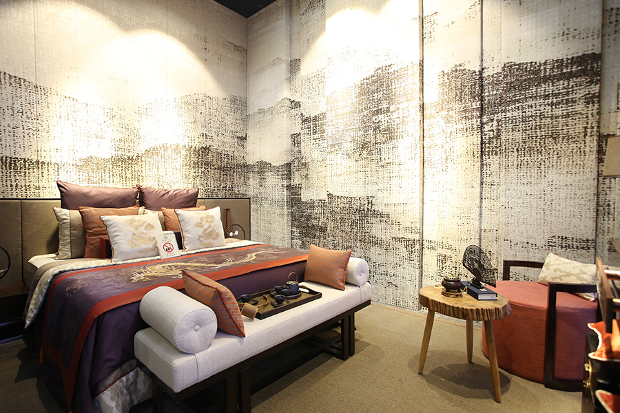 源志诚今年展现出来的是现代中式风格的延续,产品工艺以大提花为主,整幅大提花做墙布,非常罕见。源志诚主打三大色调:从水墨演变出来的蓝绿色,清新时尚;素雅的棕色融入龙的元素,传统古朴;红色又是深受中国人喜爱的颜色,怎么用都不为过。