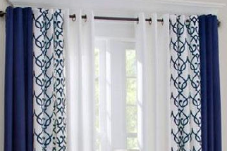采用两种花色拼接的窗帘样式,两侧是深蓝纯色,中间是白底蓝花的几何图案,展现更为丰富的家居氛围。柔美的色彩、光滑的布面、精致的纹理,富有宫廷气质的窗帘,呈现出华丽而细腻的洛可可风貌。